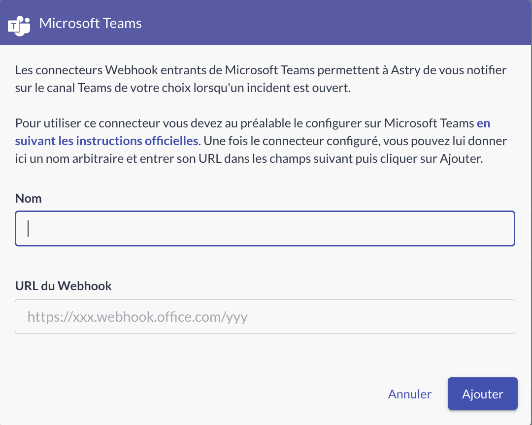 Dans cette page, nous allons détailler le processus de configuration d’un Webhook Teams pour que Astry me notifie.